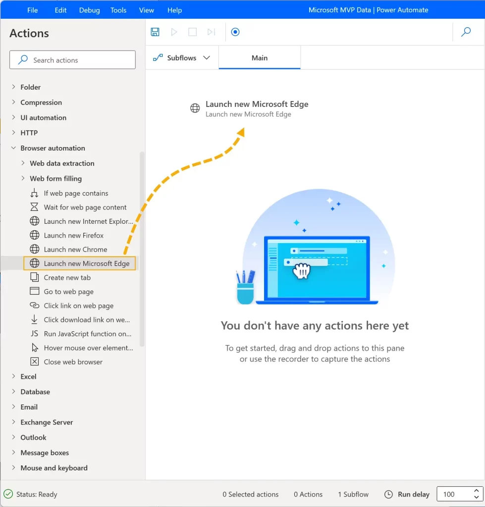 In the Browser automation dropdown, drag Launch new Microsoft Edge into the main pane for a pop-up window to appear.