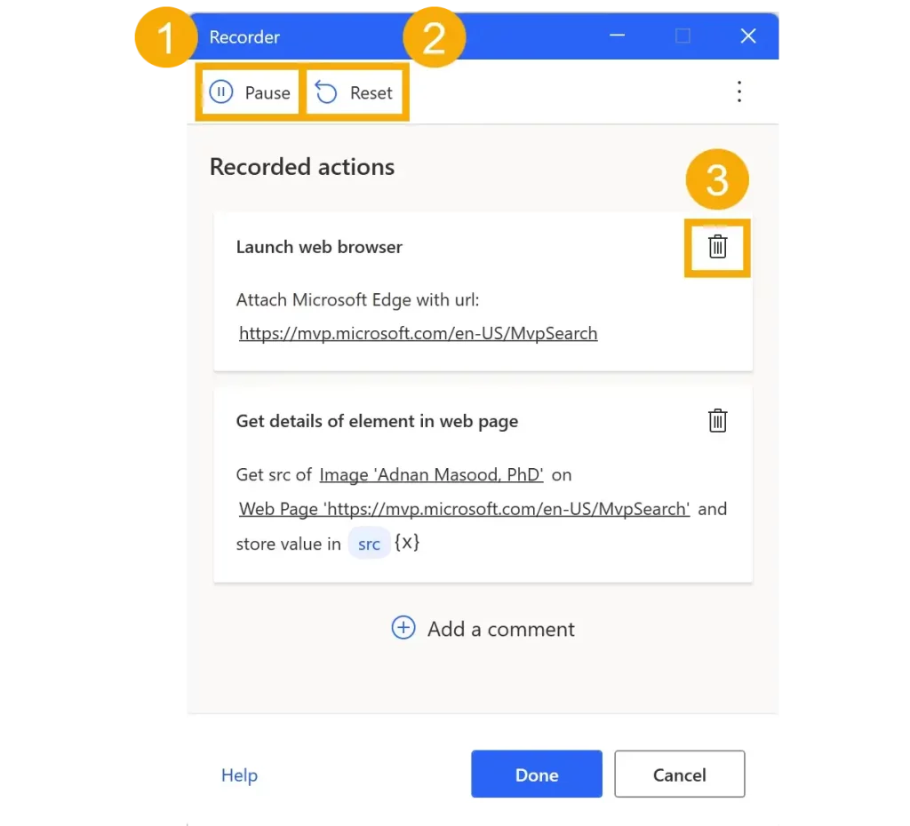 Power Automate added an unnecessary Launch Microsoft Edge action when the recorder started. To remove this, right-click on it and choose Delete.