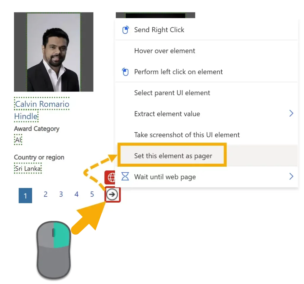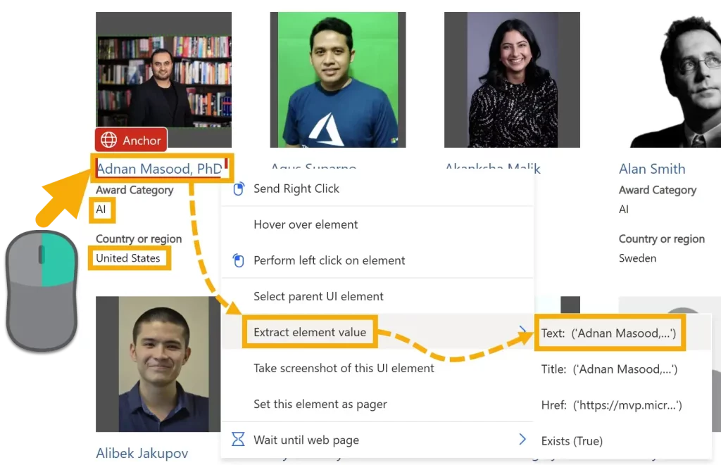 Extract the name, Award Category, and Country or region using the same process as the previous step, except choosing the Text option instead.