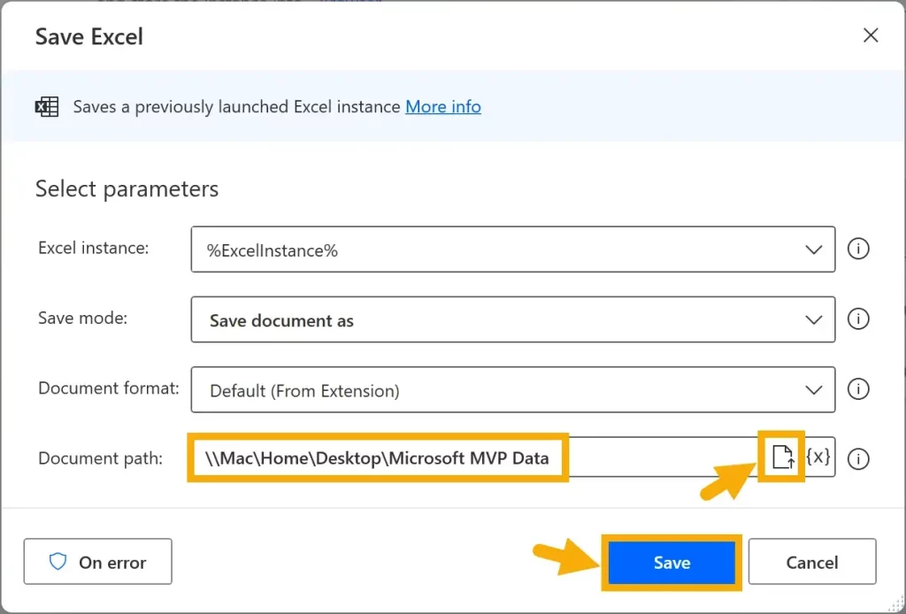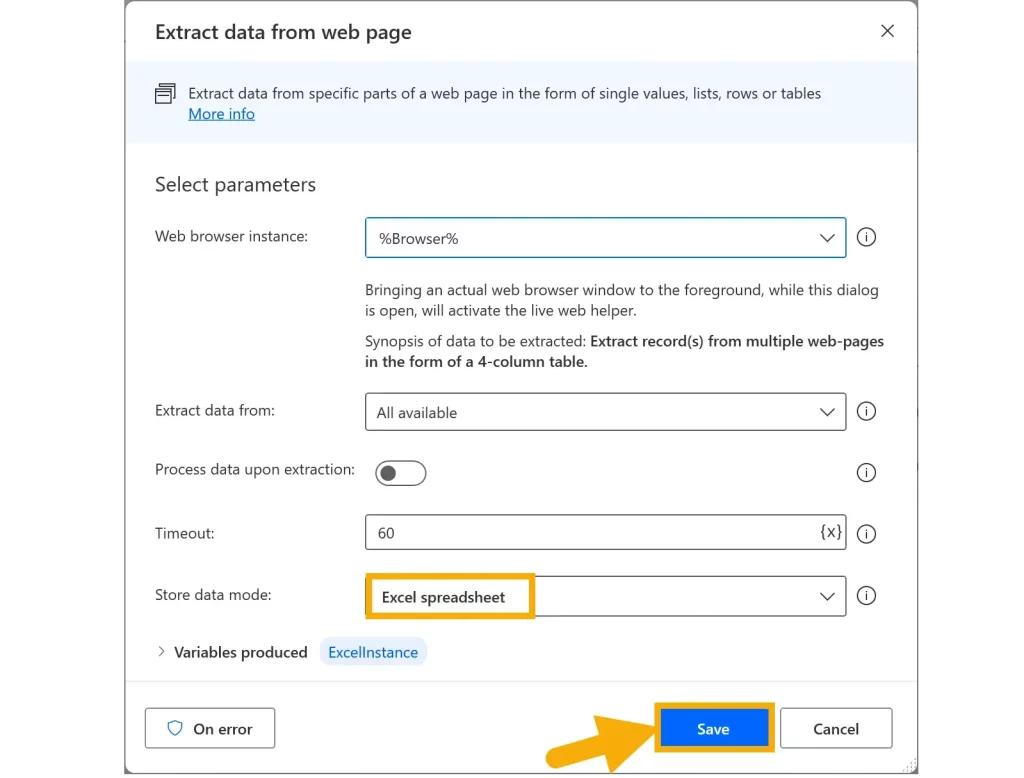 In the Store data mode dropdown, choose Excel spreadsheet to update the variable to ExcelInstance, and then select Save.