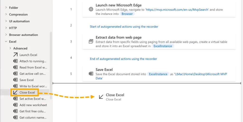 In the Excel dropdown, drag Close Excel into the main pane.
