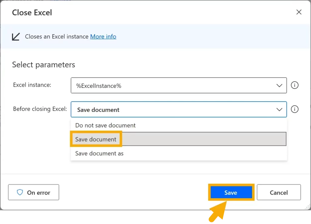 In the Before closing Excel dropdown, choose Save document and then select Save.