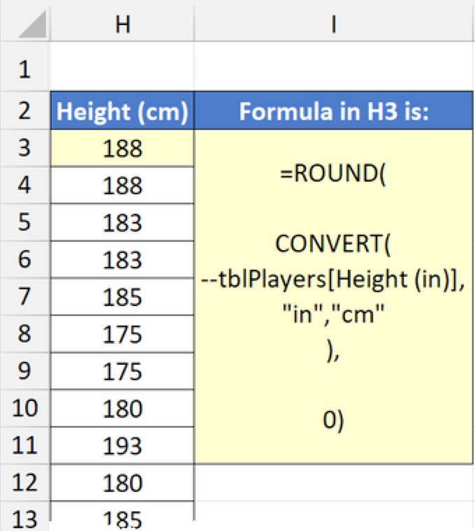 For height, the Height (in) column is referenced in CONVERT’s number argument. The from_unit is “in” for inches and the to_unit is “cm” for centimetres.