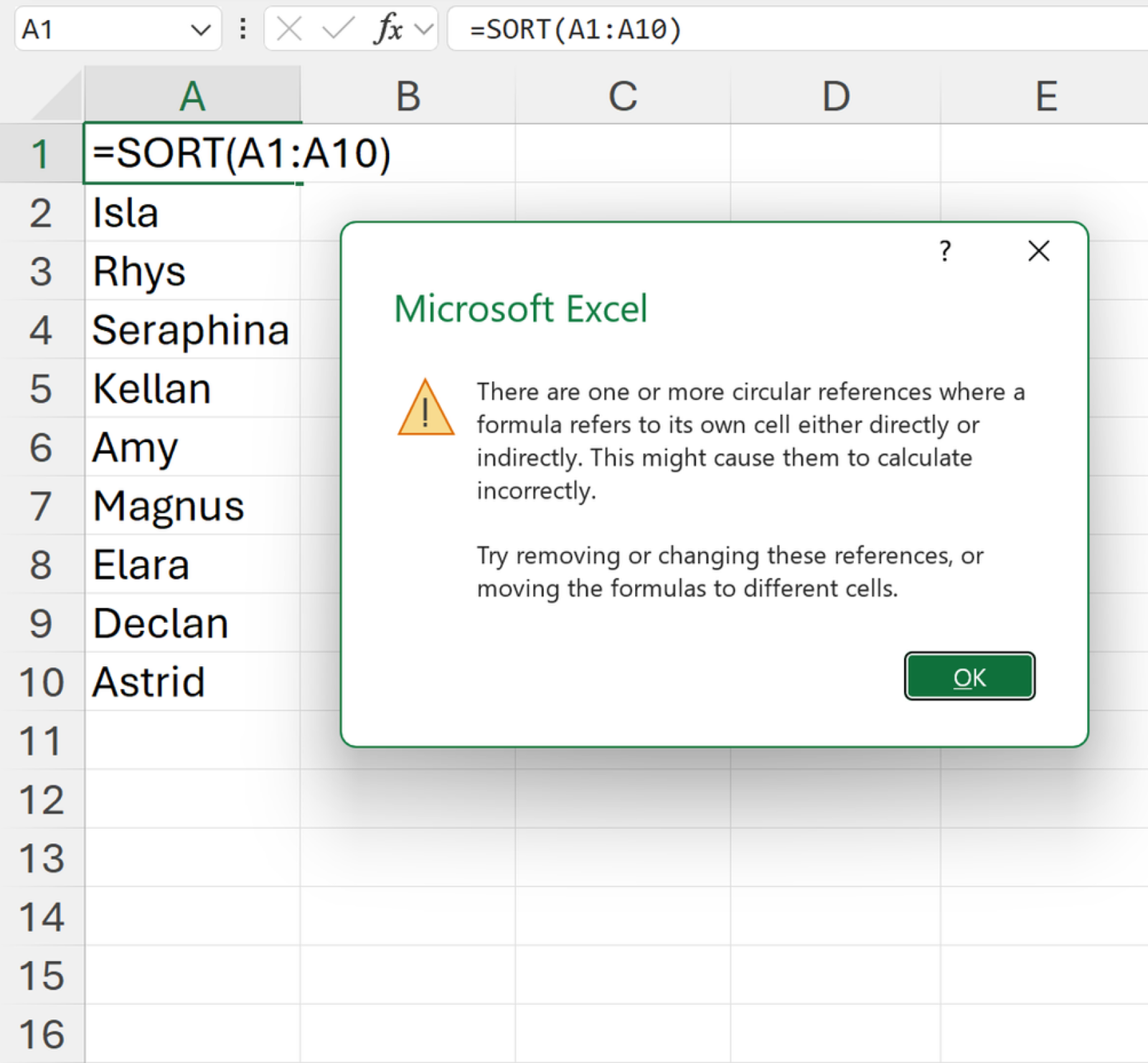 If =SORT(A1:A10) is used in A1 instead, not only does it override the existing value Xavier, but a popup appears, alerting you to the circularity. Clicking OK permits the formula, although the result is a crossed-out 0, indicating a stale value.