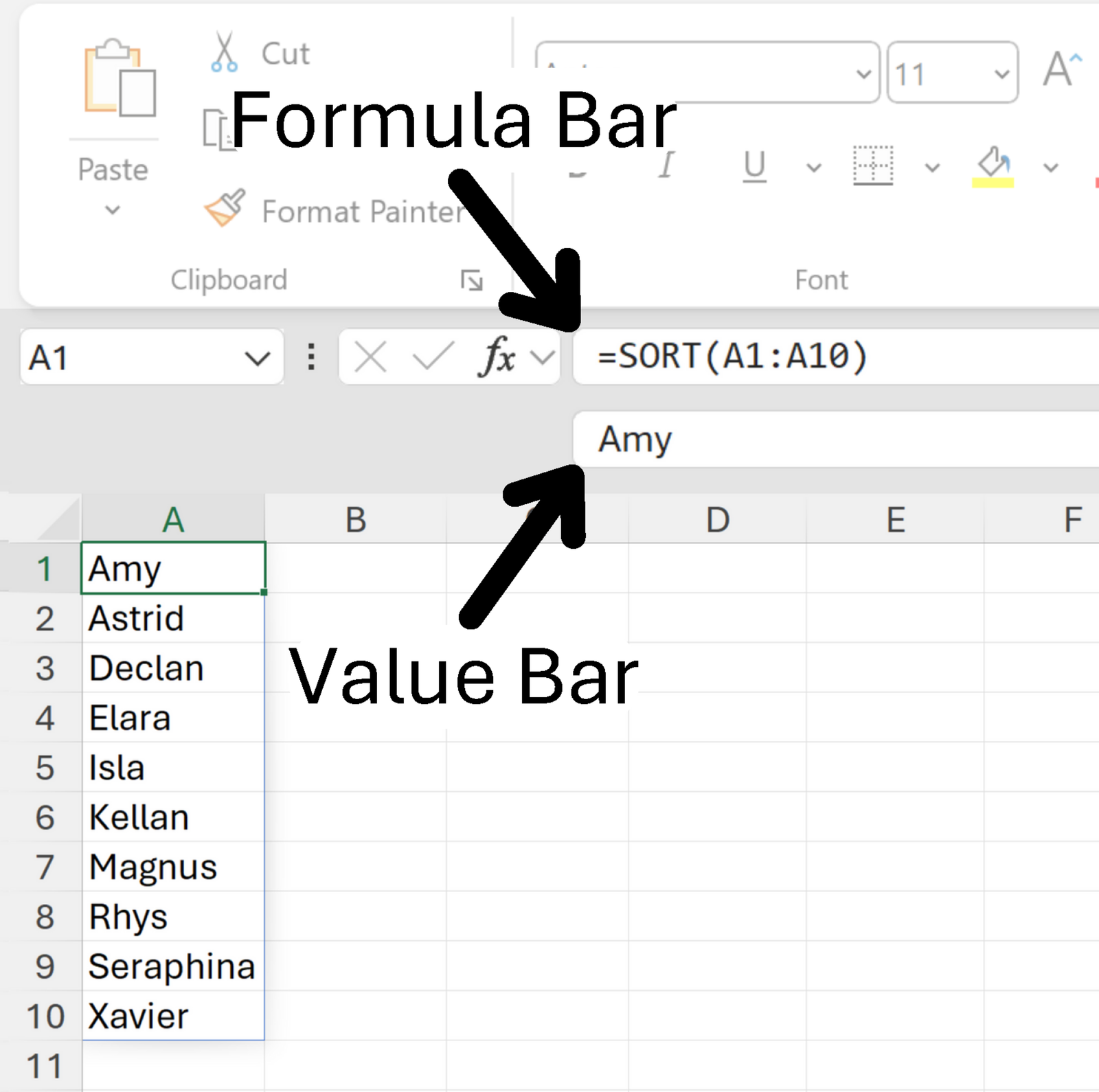 10 names are listed in A1:A10. To sort these in ascending order, a formula can be constructed elsewhere that references the range. In this case, C1 contains =SORT(A1:A10).