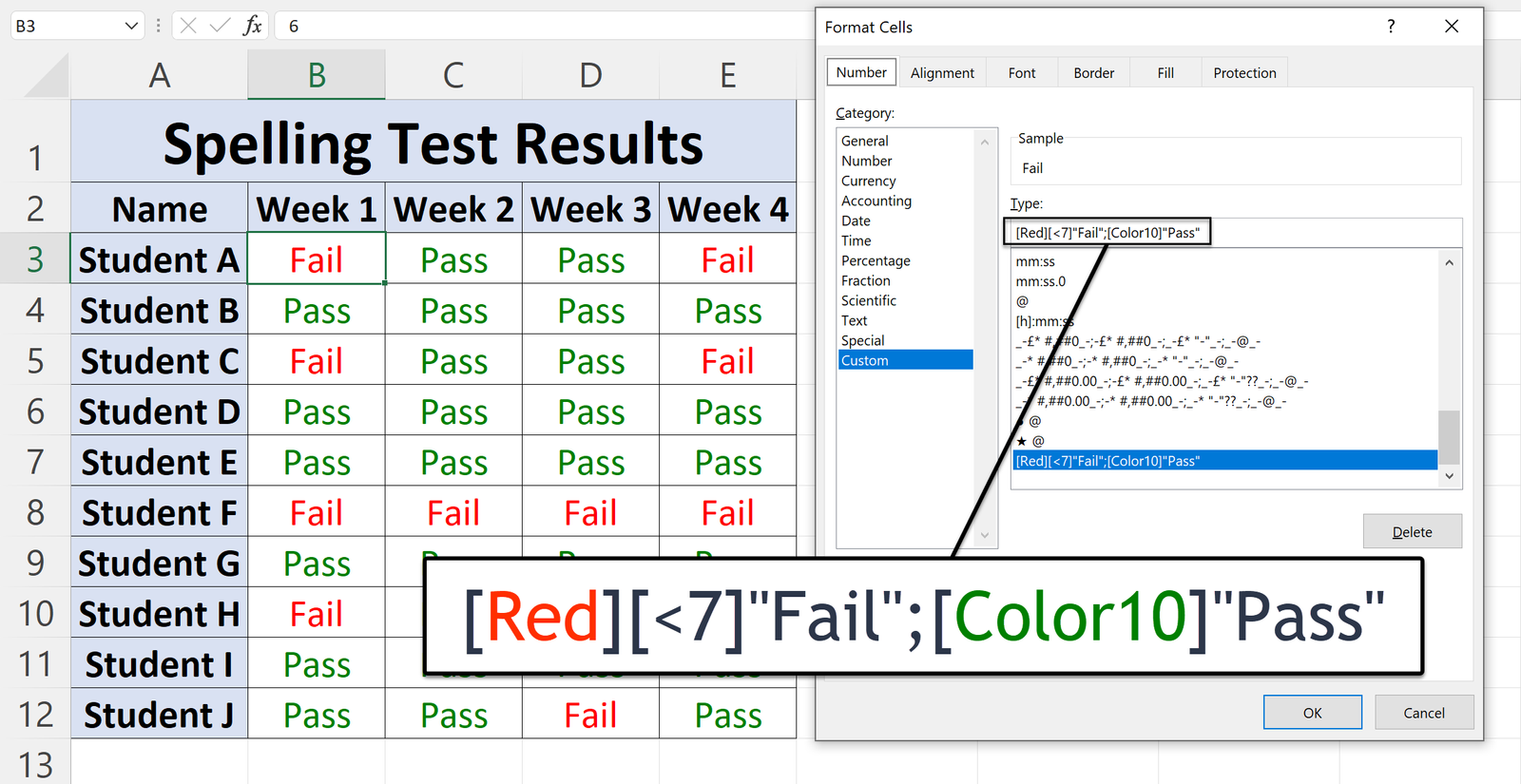 Values below seven will output as “Fail” (in red) and ones seven or above as “Pass” (in green).