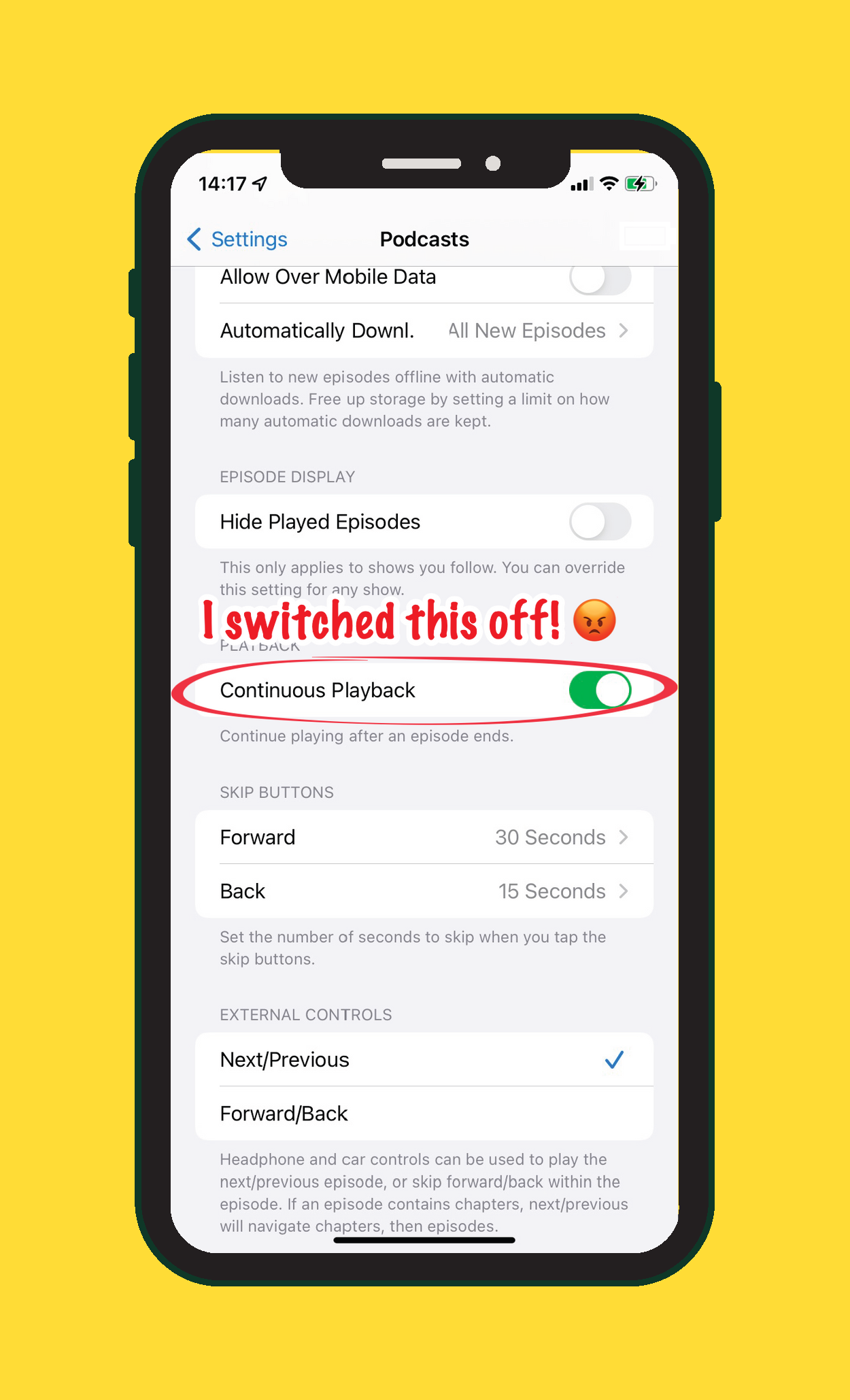 I had to go into my iPhone’s settings to toggle the Continuous Playback switch because it had reverted — AGAIN!