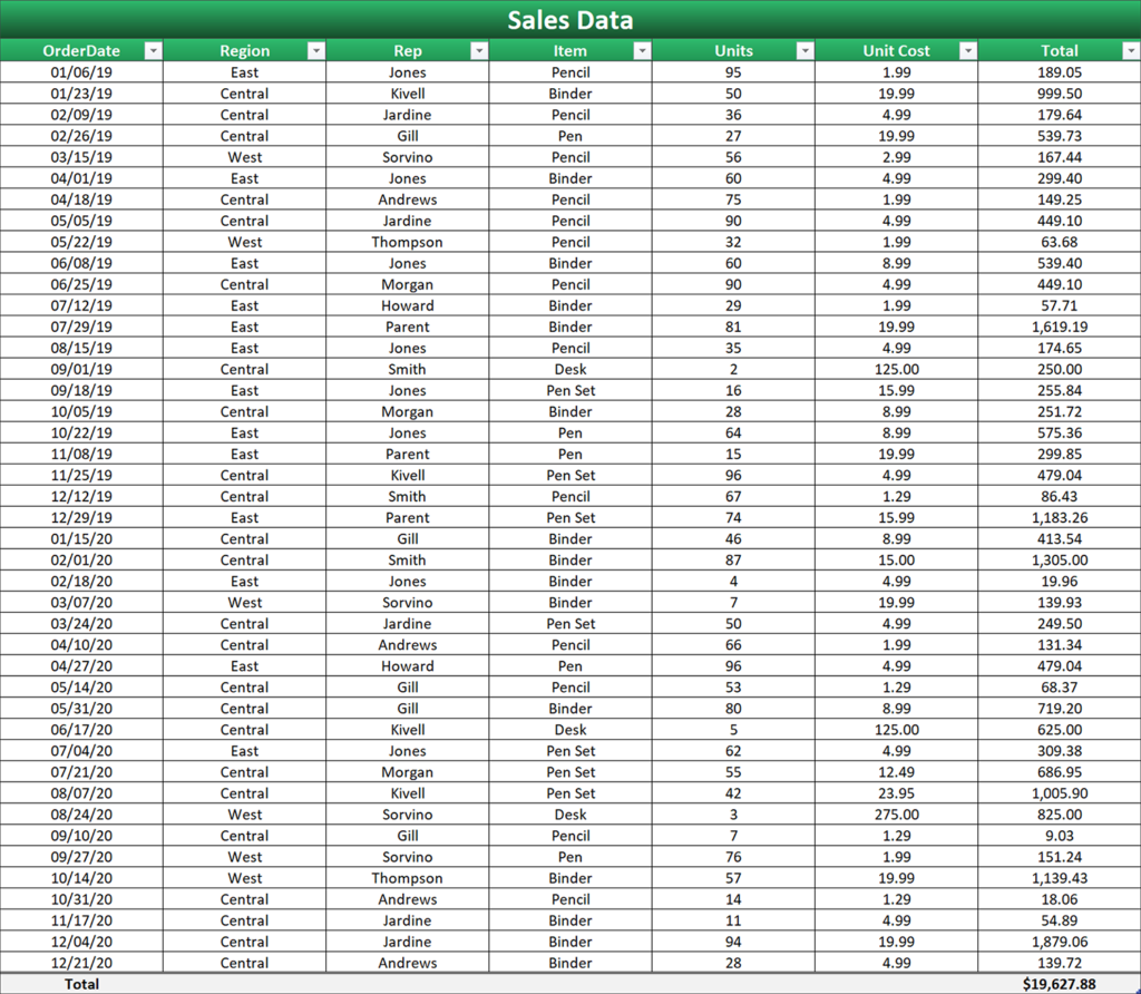 I’ve used sample sales data from contextures.com for the examples. The table is found at the bottom of the worksheet.