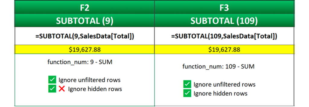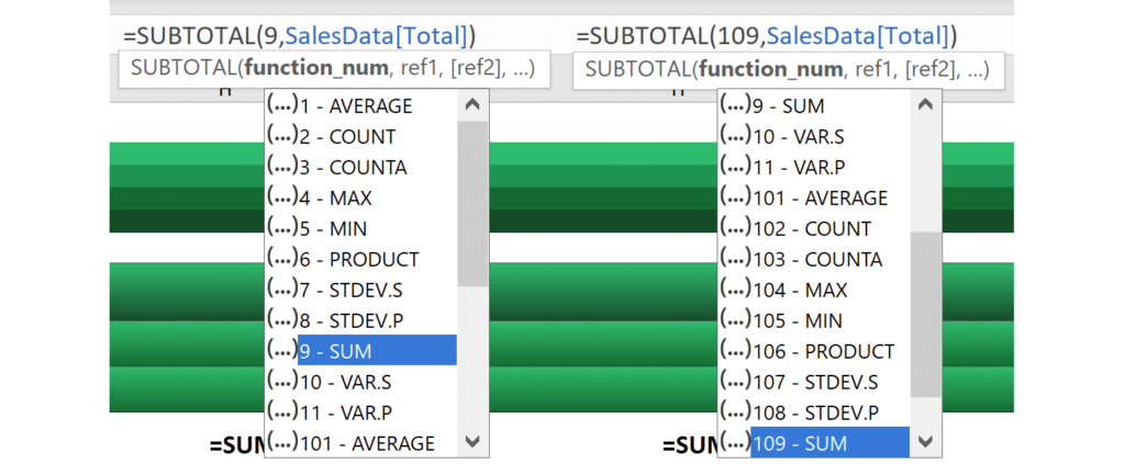 SUBTOTAL has a function_num argument consisting of a list of functions. Numbers 1–11 include hidden rows in their calculations, whereas 101–111 exclude them.