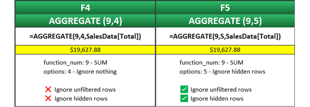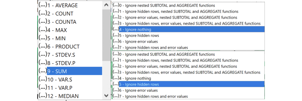 AGGREGATE also has function_num, but it’s a little different. There are 19 distinct functions compared to SUBTOTAL’s 11. Additionally, there is an options argument that has eight variations for how rows should be treated.