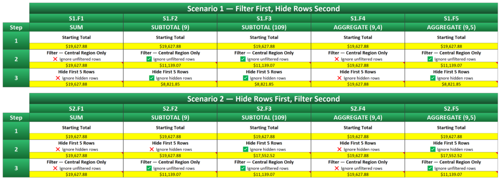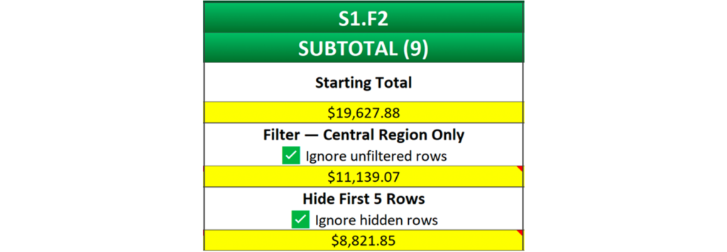 For the most part, there are no real surprises with the results Excel pumps out. However, look at the differences between the scenarios. Apart from examples S1.F1/S2.F1 and S1.F4/S2.F4, the others produce different results depending on whether the rows are filtered or hidden first.