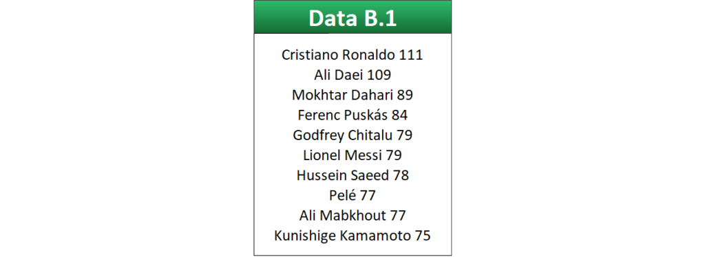 Value B.1 displays a list of the 10 all-time highest scorers in international football.