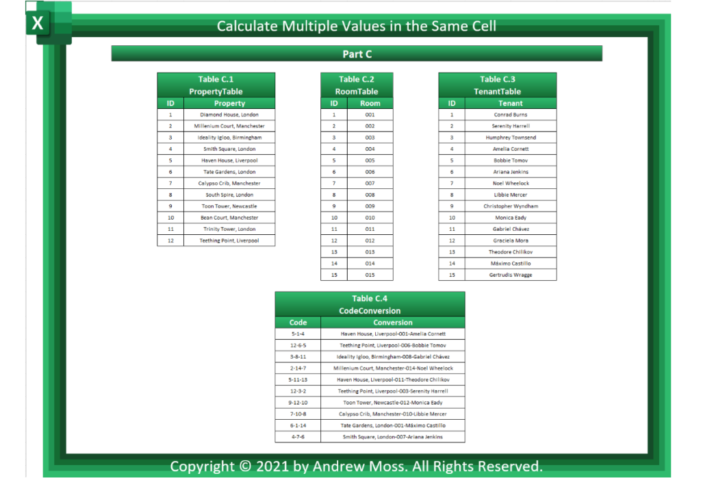 The same XLOOKUP statement is applied to the room and tenant tables to receive a final result of Haven House, Liverpool-001-Amelia Cornett.