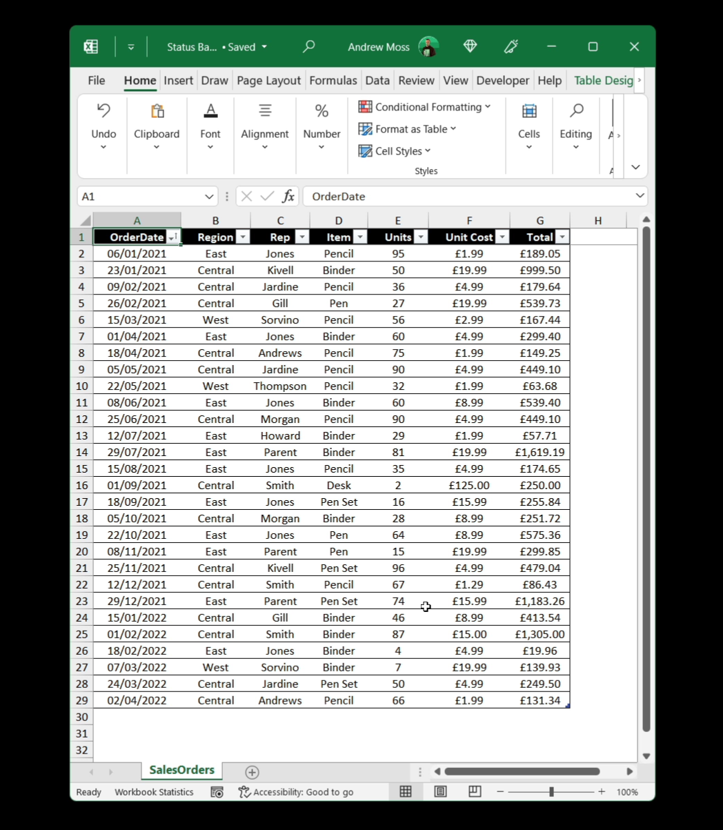 Excel’s status bar shows various statistics based on the values in the selected cell range (e.g. sum, average, max and min).