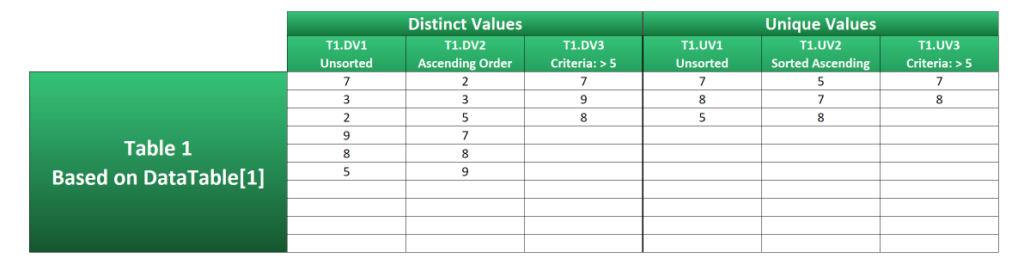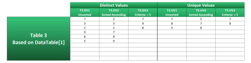 T3.DV3 shows how distinct values over 5 are extracted by wrapping a FILTER statement inside the UNIQUE function and using the condition DataTable[1]>5 in the include argument.