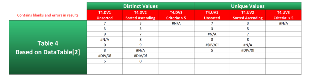 Although the others still return a result, examples T4.DV3 and T4.UV3 completely break down because of the error values in the data. Even if you take out the #N/A from DataTable[2], the result will be #DIV/0! instead.