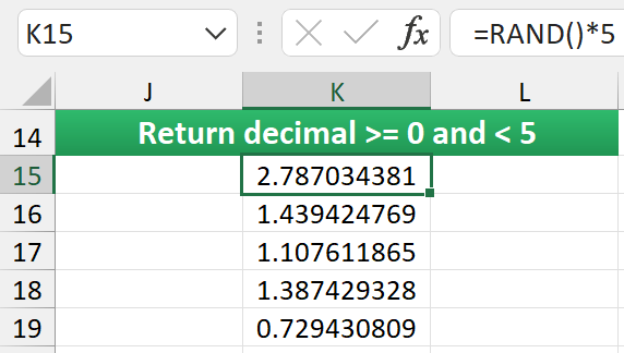 Formula to return a random decimal greater than or equal to 0 and less than 5: