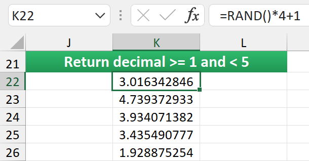 Formula to return a random decimal greater than or equal to 1 and less than 5: