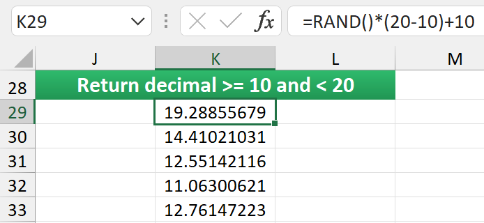 Formula to return a random decimal greater than or equal to 10 and less than 20: