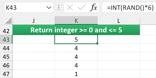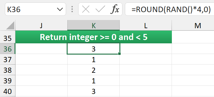 Formula to return a random integer greater or equal to 0 and less than 5: