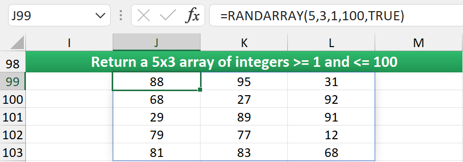 Formula to return a 5×3 (rows x columns) array of random integer numbers between (and including) 1 and 100: