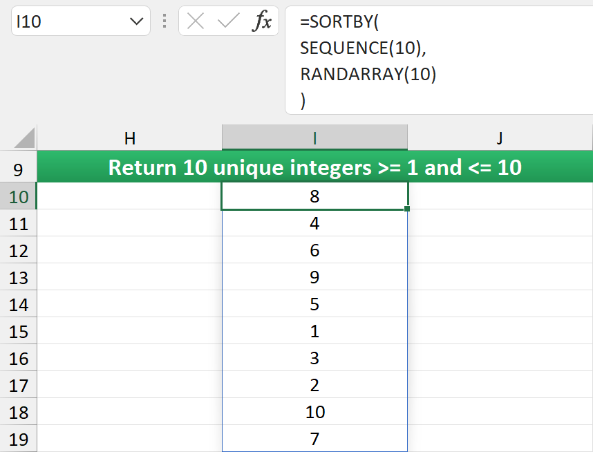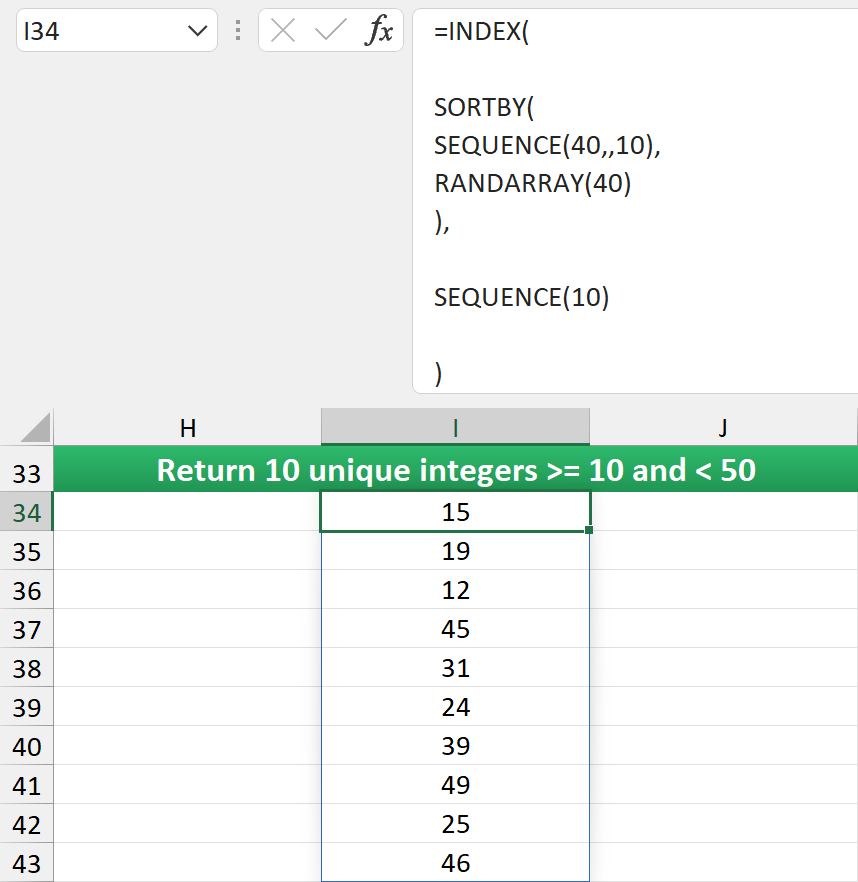 Formula to return 10 integers greater than or equal to 10 and less than 50: