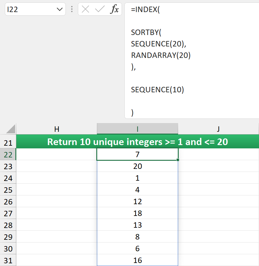 You should learn how to convert formulas into lambdasโโโitโs a real time-saver! I founded RANDUNIQUE, which returns a set of unique random numbers based on given parameter values.