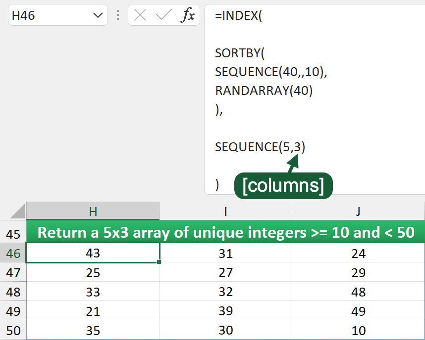 Formula to return a 5×3 array of unique integers greater than or equal to 10 and less than 50: