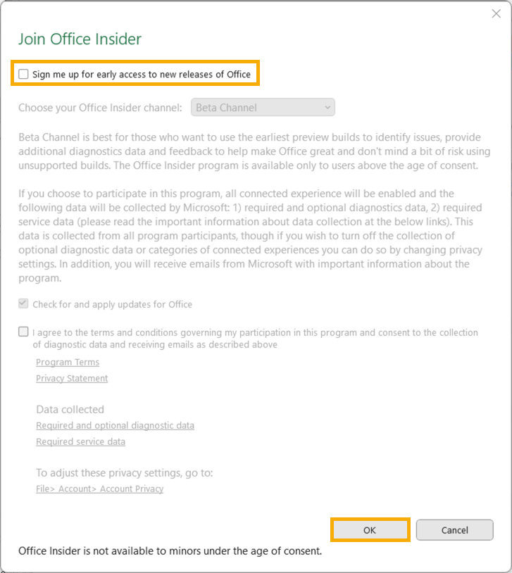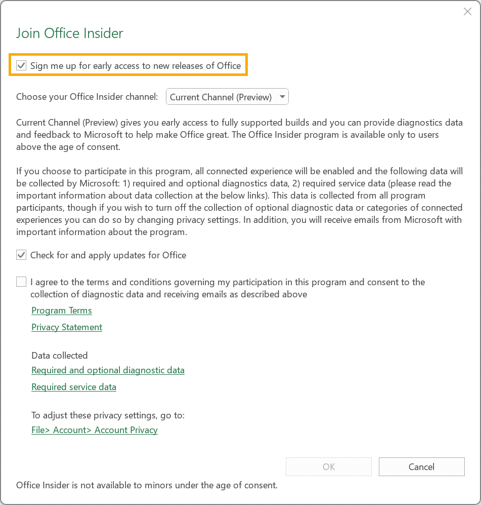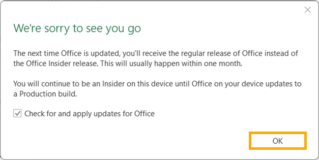 Select the Sign me up for early access to new releases of Office checkbox to untick it, and then select OK.