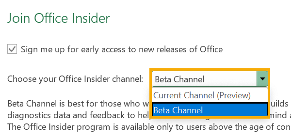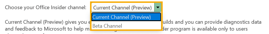 Select either Current Channel (Preview) or Beta Channel in the dropdown list.