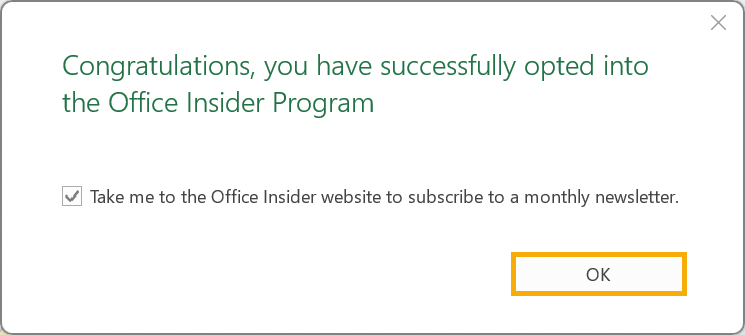 Keep the checkbox ticked to be taken to the Office Insider website (to subscribe to a monthly newsletter), and then select OK.