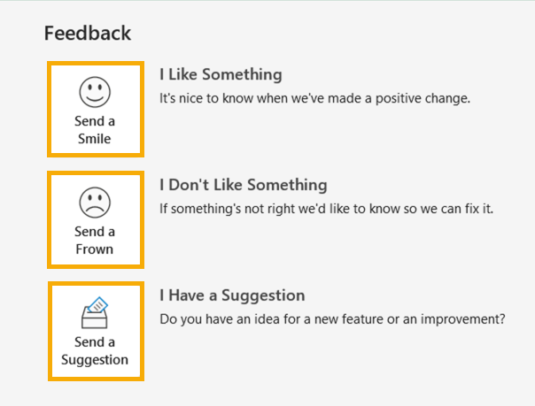 - Send a Frown—when you’ve spotted a bug, glitch, or want to constructively criticise something.