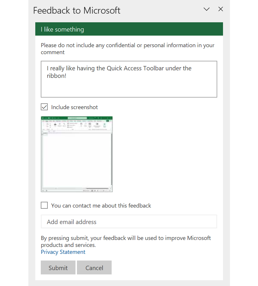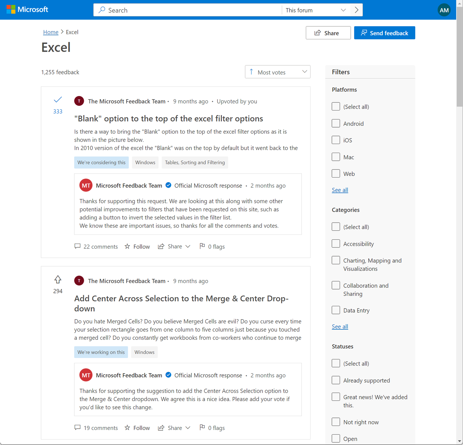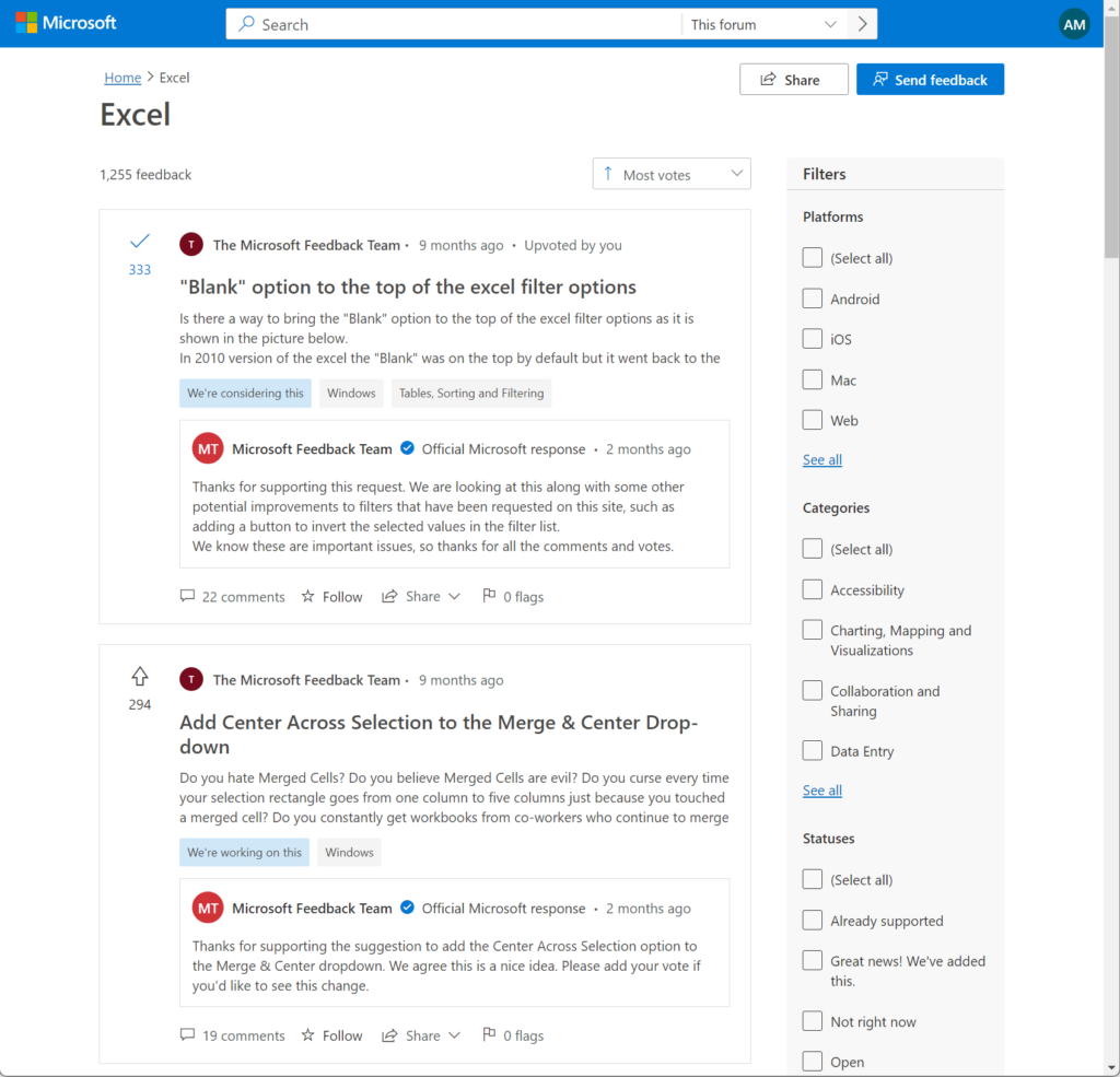 Send a Suggestion takes you to a dedicated Microsoft Feedback Portal for the app you’re in. This is a public forum for posting about issues, ideas, and feature requests.