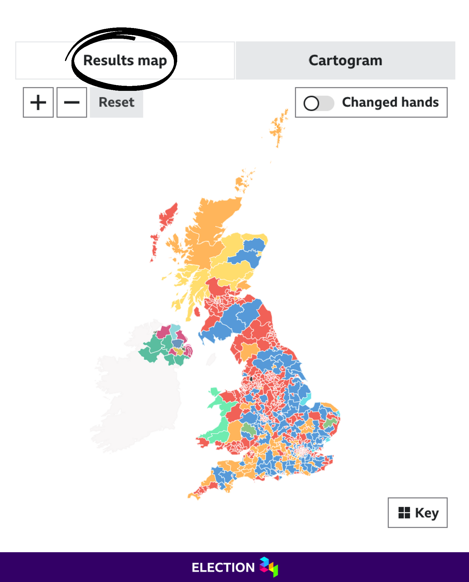 If you had no prior knowledge about UK politics, a quick glance underneath the default Results map tab is bound to make you think Conservative won the election based on blue appearing to be the most common colour overall.