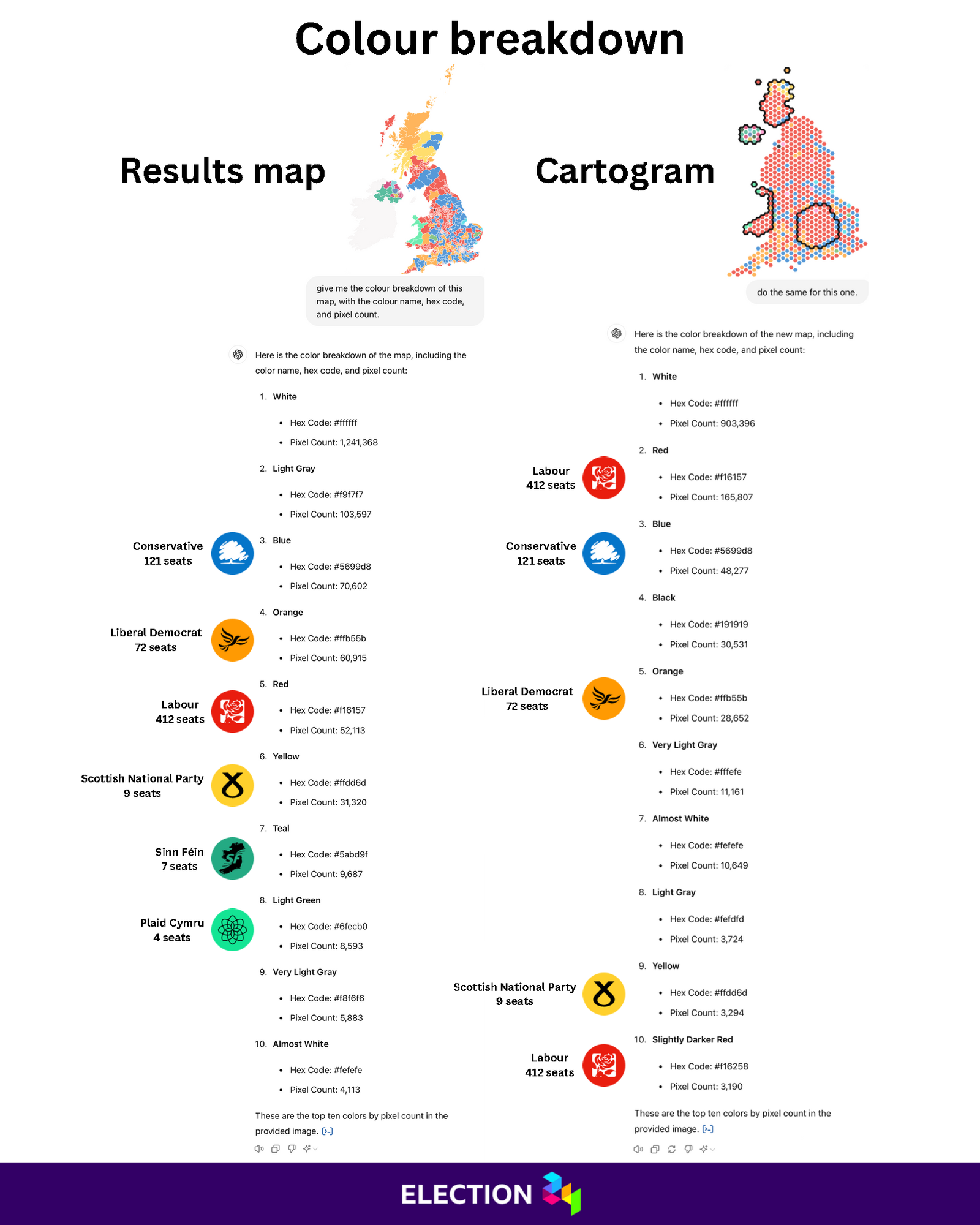The only noticeable error ChatGPT made was detecting 3,190 pixels in an almost undetectably darker shade of red. Maybe this wasn’t an error — I don’t know. Given the humongous pixel count of the first Labour entry, it’s all rather academic anyway.