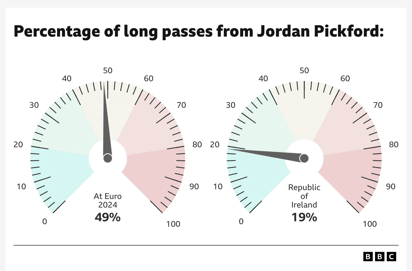 They were used to visualise the percentage of long passes made by Three Lions goalkeeper Jordan Pickford compared to Euro 2024.