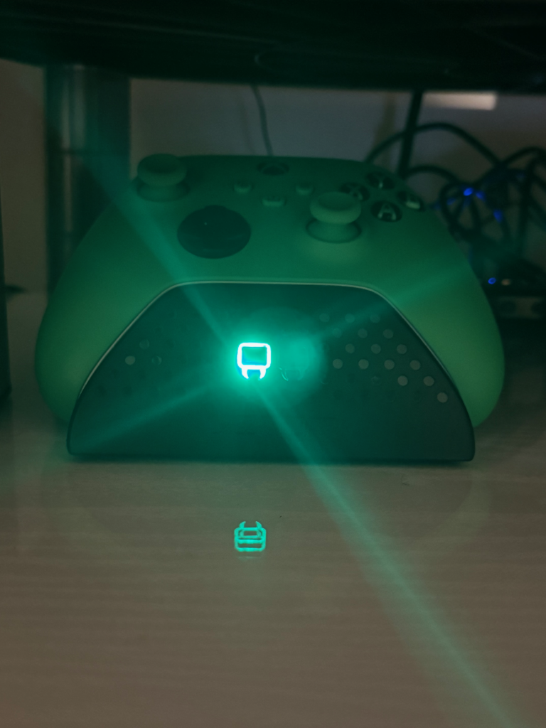 🟢 An Xbox controller dock with a large green LED.