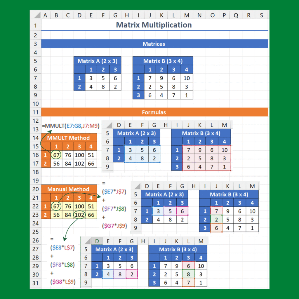 The Manual Method shows two examples of how you would do this without MMULT. It involves multiplying each row cell in Matrix A by each equivalent column cell in Matrix B.