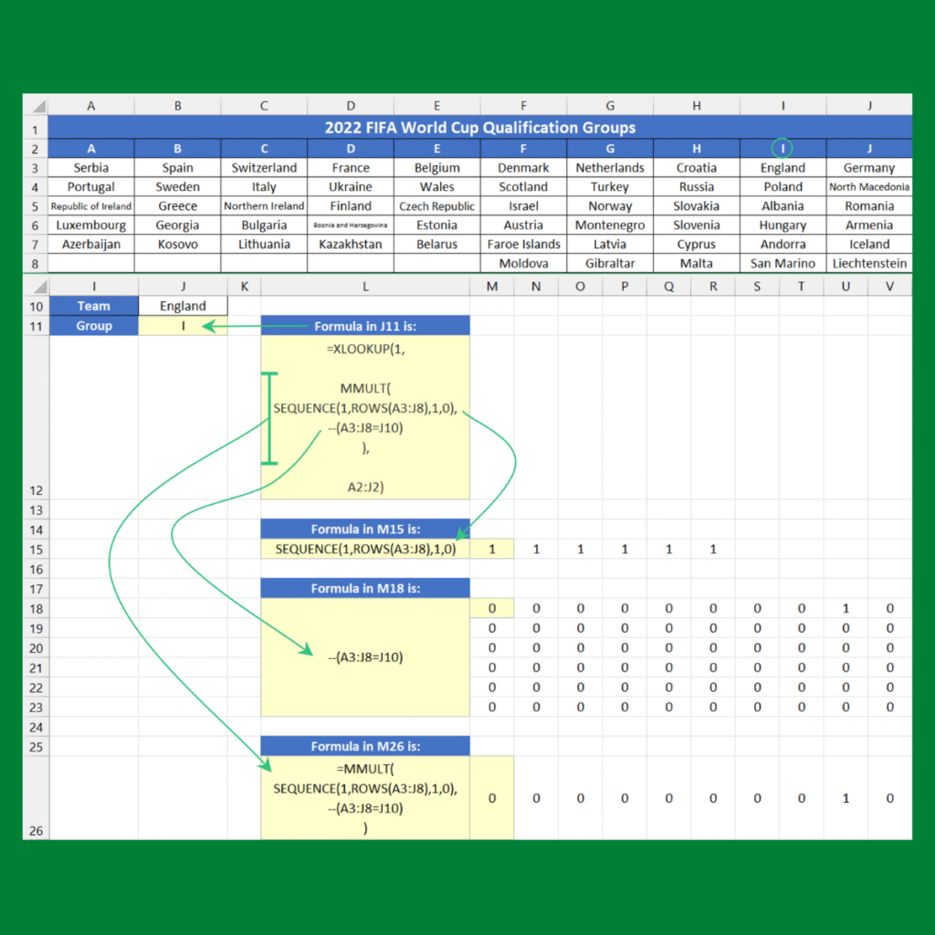 Put together, the result is a 1 x 10 array of Booleans with a solitary 1 in the column England is in (M26).