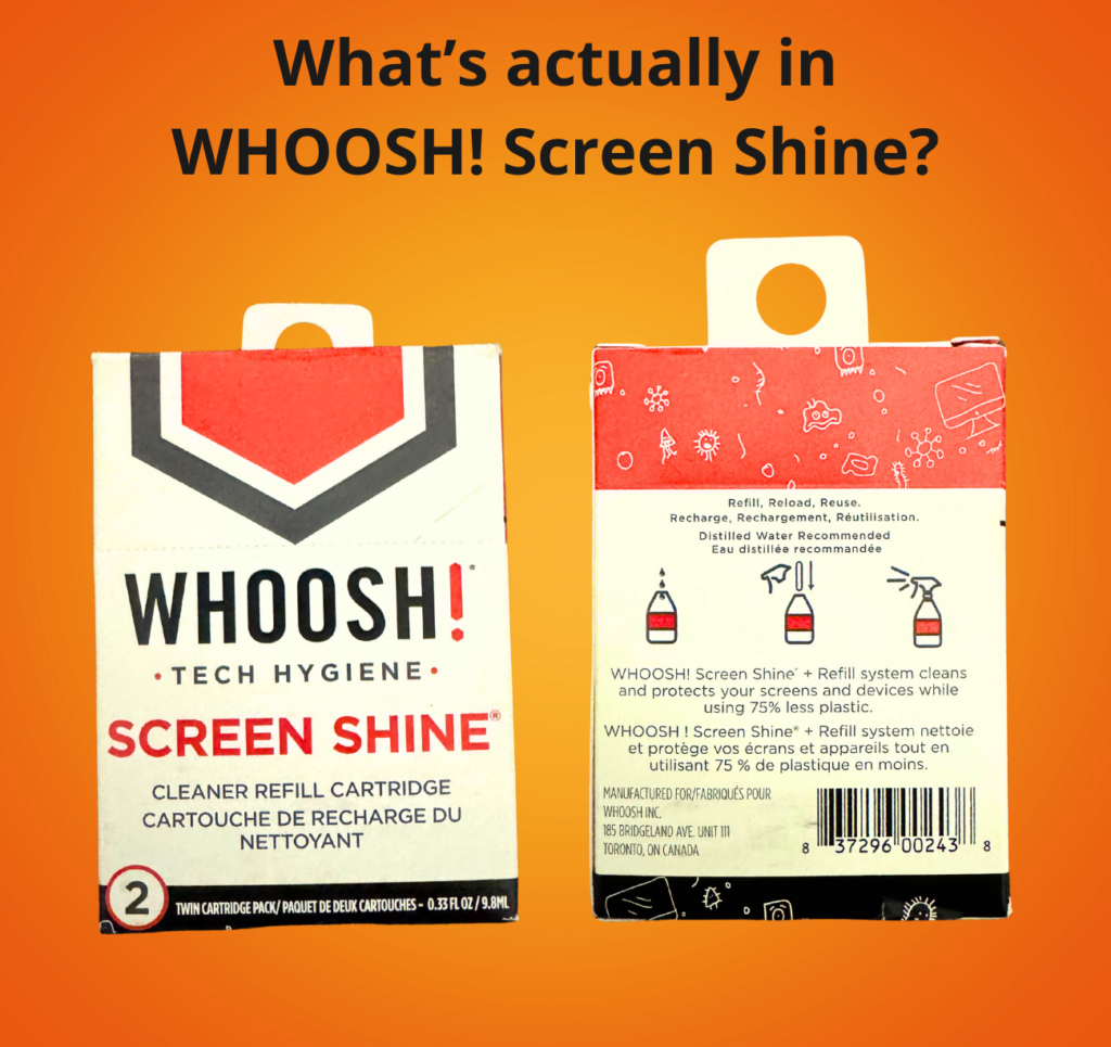 All WHOOSH! products are reportedly composed of 90–99% distilled water with 1–5% Screen Shine.