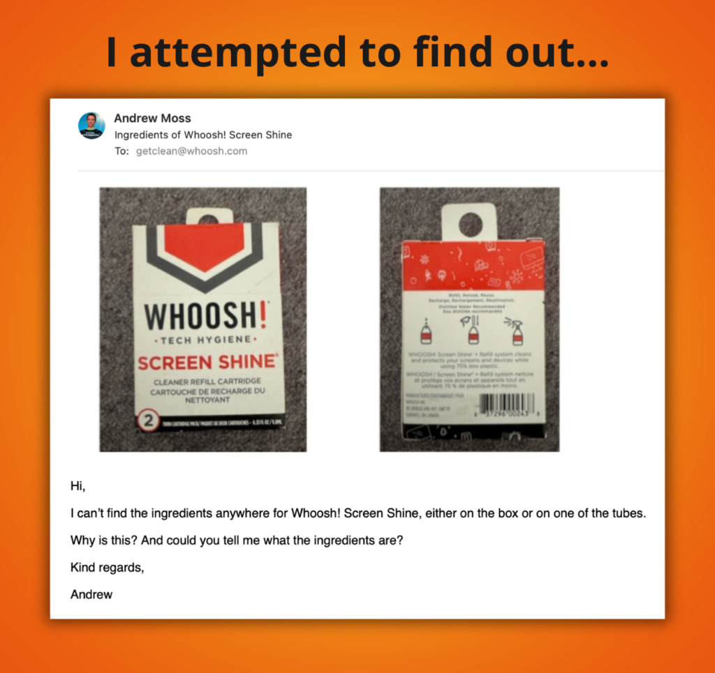I understand what distilled water is, but I was intrigued to find out more about Screen Shine, given WHOOSH! doesn’t list the ingredients anywhere. I always thought this was a legal requirement, although maybe because it isn’t toxic, the company is not obligated to do so.