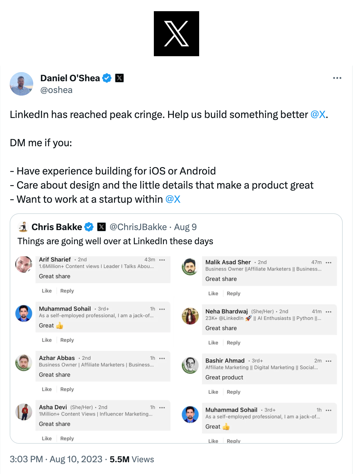 None of this has gone unnoticed. Over at X, engineer Daniel O’Shea responded to colleague Chris Bakke‘s post (https://lnkd.in/eFVUiHUX) by suggesting X was planning on building a rival to break LinkedIn’s long-standing monopoly in the professional networking sphere.