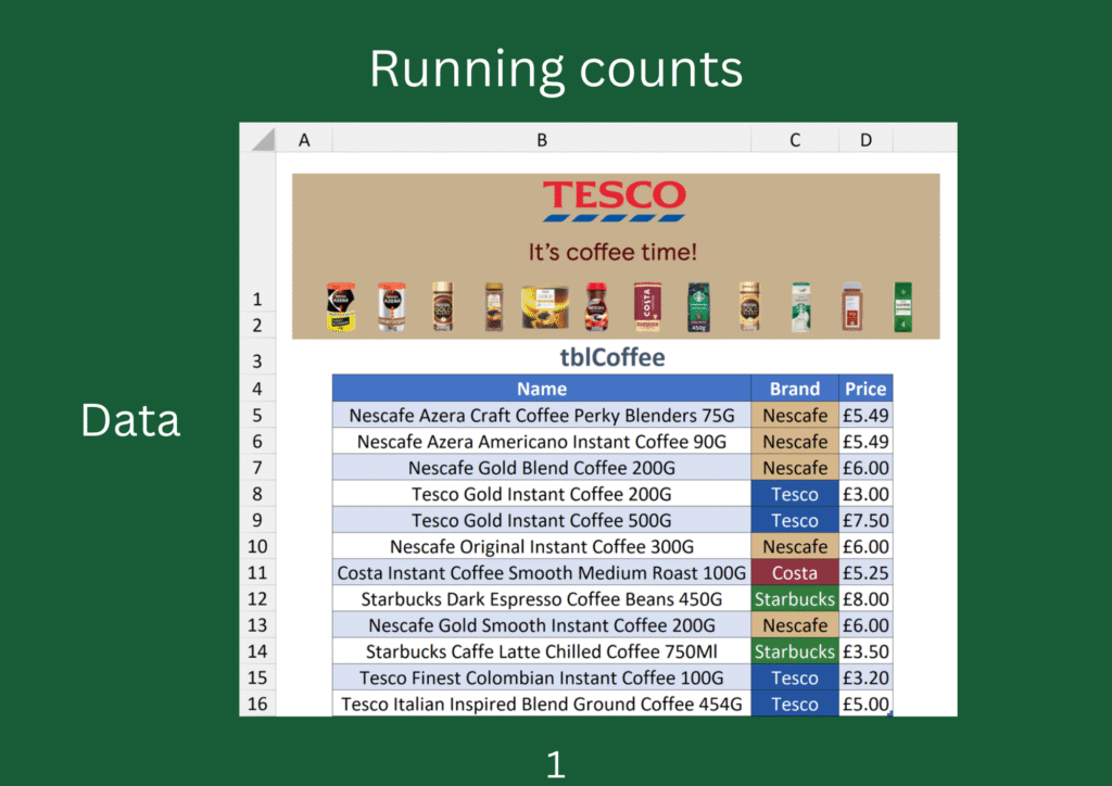 Once again, the modern approach replicates it using a single formula. Nested inside the COUNTIF function is an OFFSET statement, which starts a reference from the top row of Brand. SEQUENCE(ROWS(tblCoffee[Brand])) ensures the total rows in the range increment upwards as the formula cycles downwards.