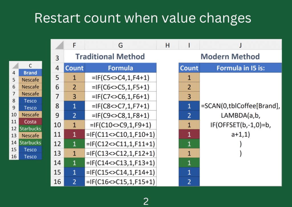 In contrast, the modern method consists of a single formula that combines SCAN, LAMBDA, IF and OFFSET. The LAMBDA statement has two parameters for the accumulator and value: a and b. With the help of OFFSET, the IF statement checks if the row value above b equals b. If so, add 1 to a; otherwise, return 1.