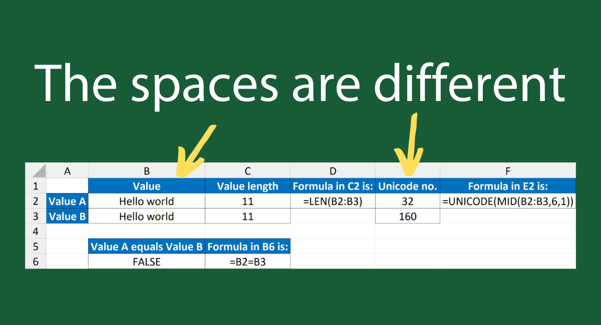 You’re most likely to encounter this problem if you copy text from the web and paste it into Excel. Only today, I had an issue with a few XLOOKUPs precisely because of this, so it’s worth being aware of.