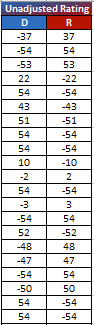 There was a process to go through in order to make this data usable for the table in the 2020 US Election worksheet. The different categories needed to be converted into a uniform graded system. All the sources used the same kind of system, but with subtle differences. Some classified states as ‘solid’ instead of ‘safe’, and in the case of Inside Elections (IE), there was a ‘tilt’ category. The Weighting column ensured that each classification was given an appropriate amount of points based on its worth. Adjacent to this, the Type column merges the party identifier (or ‘T’ for tossup) with the number of points according to the value of the category.