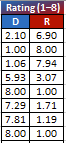 Using the values from the R column in the Rating (1–8) table, the category that pertains to each one is returned.