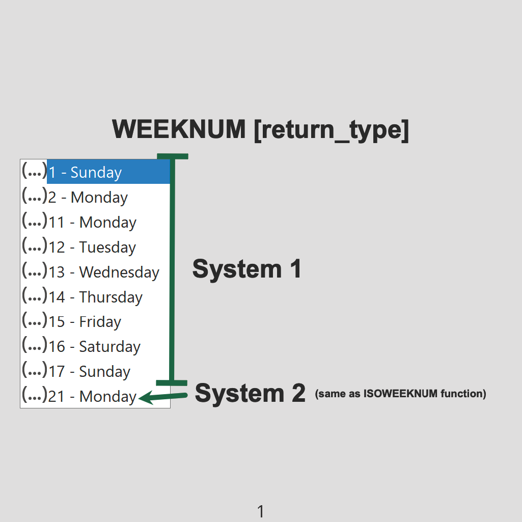 All but one are based on System 1, with the anomaly being 21 – Monday (System 2), which returns the same result as ISOWEEKNUM.
