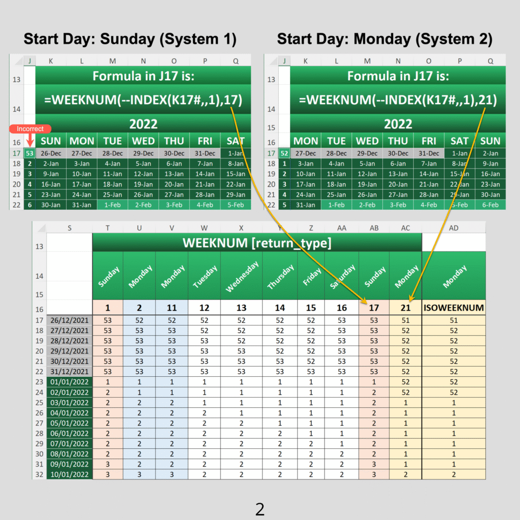 On page 2, two calendars are present — one based on a start day of Sunday (System 1), and the other on Monday (System 2). Both use formulas that reference the dates in column K, however, the first week number is wrong in the former. That’s because the reference doesn’t cover Q17, which contains 01/01/2022.
