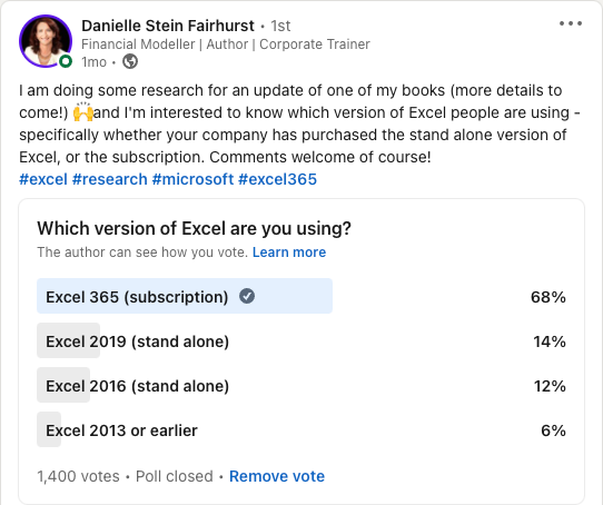 Based on 1,400 votes, 68% voted for Excel 365 (Microsoft 365), whilst a sizable 32% minority signalled they use a perpetual version.